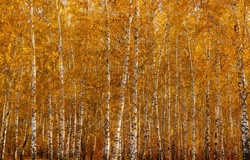 Желтые осенние листья березы. Фон ярко-оранжевой листвы. Сезонная погода. Живописная природа в березовой роще. Золотой цвет