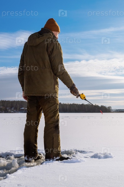 Рыбак ловит рыбу в проруби солнечный зимний день. зимняя рыбалка на льду