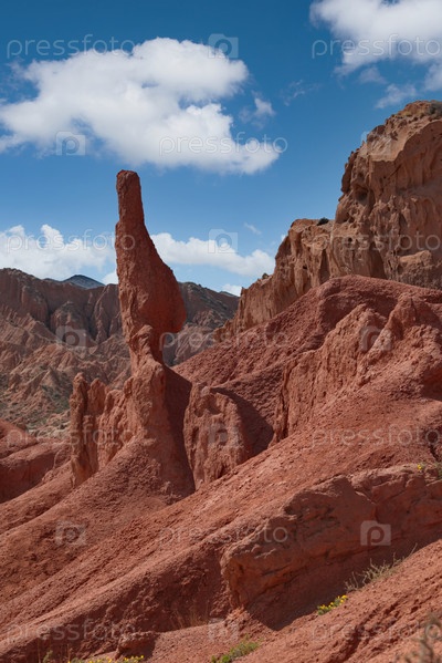 Северный Кыргызстан. Живописные виды на знаменитый каньон Сказка, глинистые горные вершины которого окрашены в яркие цвета от желтого до красно-коричневого