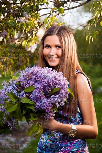 Модная молодая женщина с сиреневыми цветами в саду