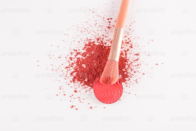 Профессиональная косметическая кисть, розовые рассыпчатые румяна. компакт, румяна, текстура декоративной косметики. вид сверху. Копировальное пространство. белый фон