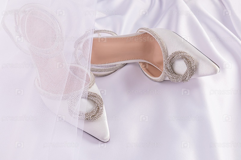 Белые атласные туфли с отделкой из стразов на белом атласном фоне со складками под прикрытием свадебной фаты. Концепция свадьбы