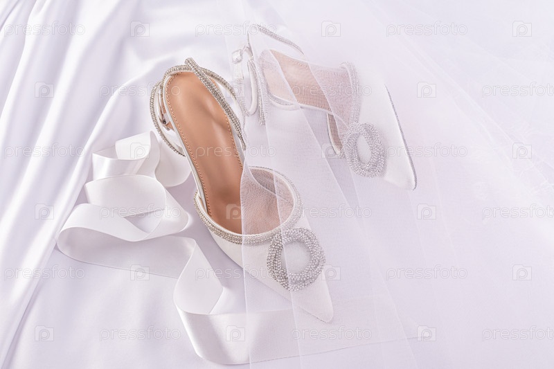 Шикарные белые свадебные туфли на белом атласном фоне со складками под нежной прозрачной вуалью. Праздничный натюрморт. Копировальное пространство