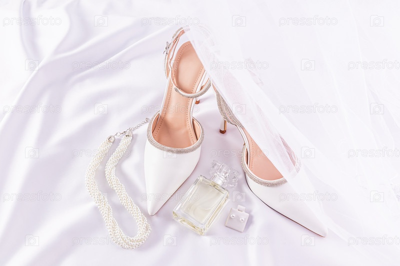Стильные свадебные аксессуары на белом атласном фоне. шикарные белые туфли, флакон духов, жемчужное ожерелье, нежная фата. свадебные детали