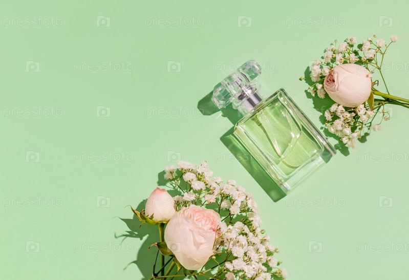 Небрендированный флакон духов на нежном светло-зеленом фоне с маленькими розами и гипсофилой. Вид сверху. пространство для копирования. Пустой макет флакона