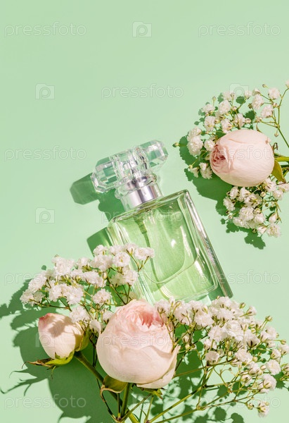 Элегантный флакон женских духов с легким цветочным ароматом на зеленом нежном фоне с цветами. Верхний вертикальный вид. Копировальное пространство