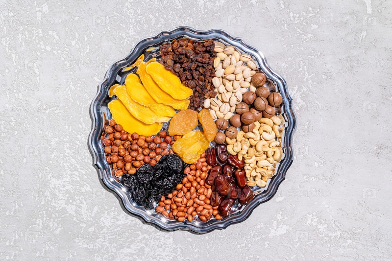 Большое серебряное блюдо с сухофруктами и орехами на сером цементном фоне. Вид сверху. Копировальное пространство. Концепция Ту Бе Шват. Здоровая пища