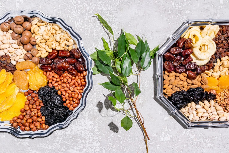 Два красивых серебряных блюда с сухофруктами и орехами, ветка зеленого дерева. Вид сверху. Угощения и символы праздника Ту Бе Шват