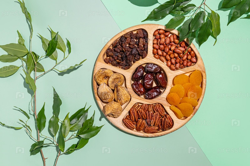 Большое деревянное блюдо с сухофруктами и орехами среди зеленых молодых веток. Вид сверху. Традиционная еда и символы праздника Ту Бе Шват