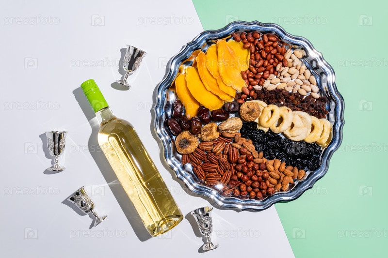 Большой серебряный седер с традиционными угощениями Ту би Швата и бутылкой вина с серебряными бокалами на светлом фоне. Вид сверху
