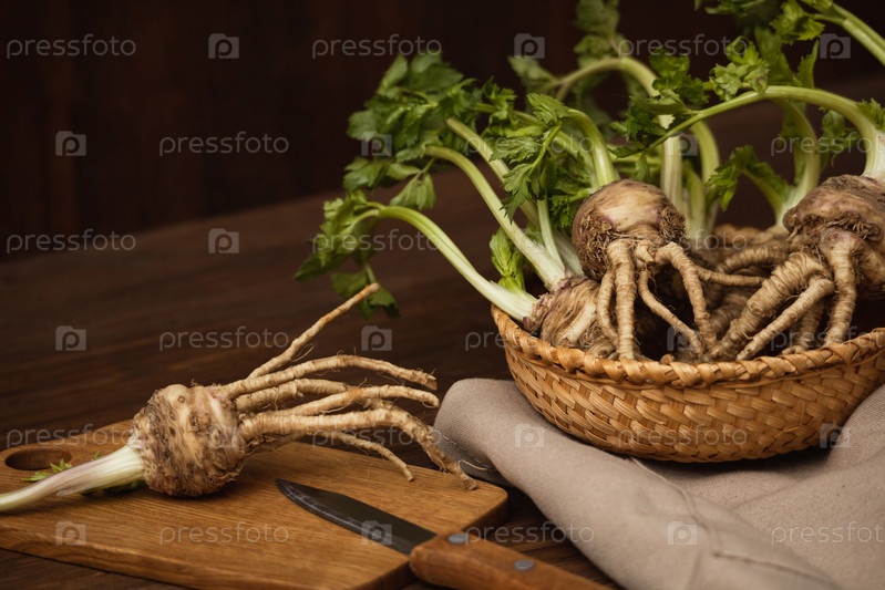 Корневой сельдерей в плетеной тарелке на тканевой салфетке на деревянном фоне, рядом с ним лежит корень на разделочной доске