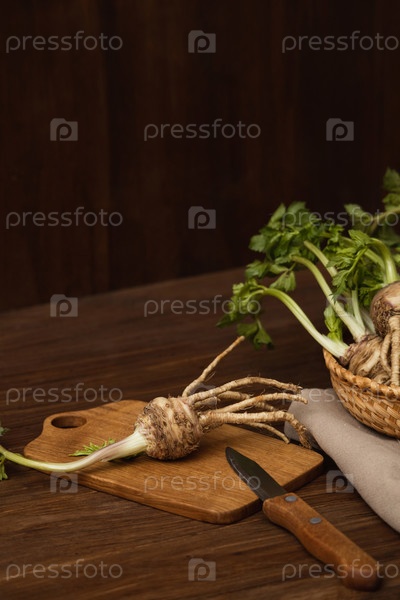 Корень сельдерея на разделочной доске на деревянном фоне с местом для копирования