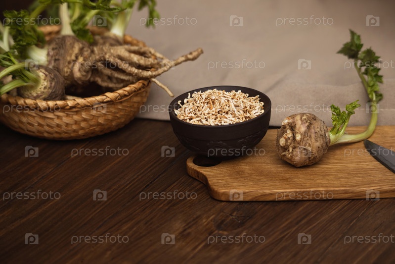 Свежий сельдерей с верхушками и корнями, измельченный сушеный вариант в миске с местом для текста