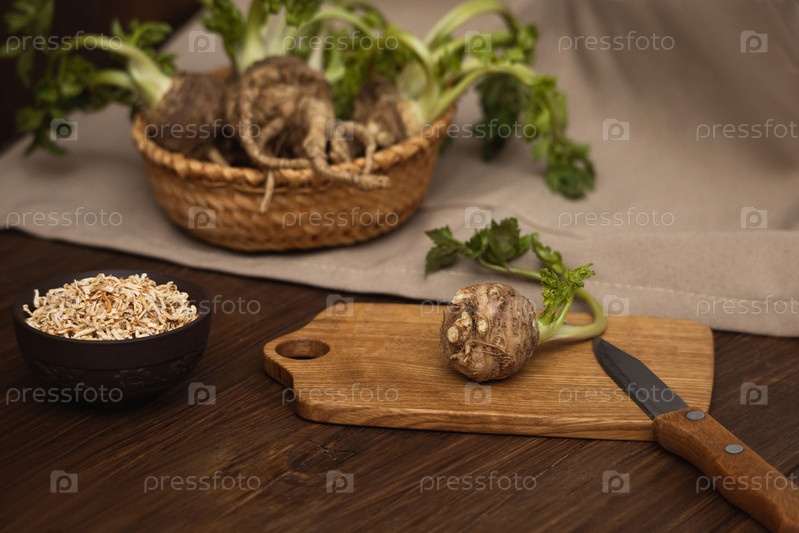 Приготовление корневого сельдерея на деревянном столе, деревенский