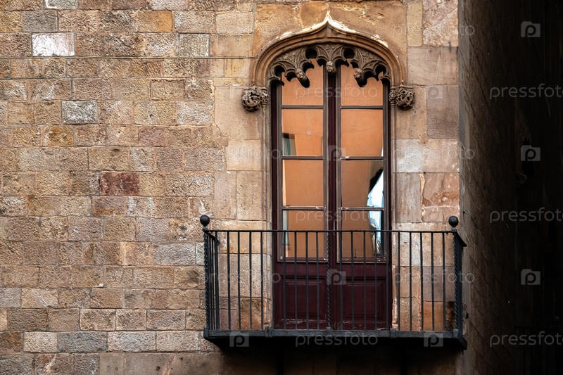 Балкон с чугунными перилами и прямоугольной балконовой дверью со фигурной аркой на старой каменной стене. из серии дверей Peace