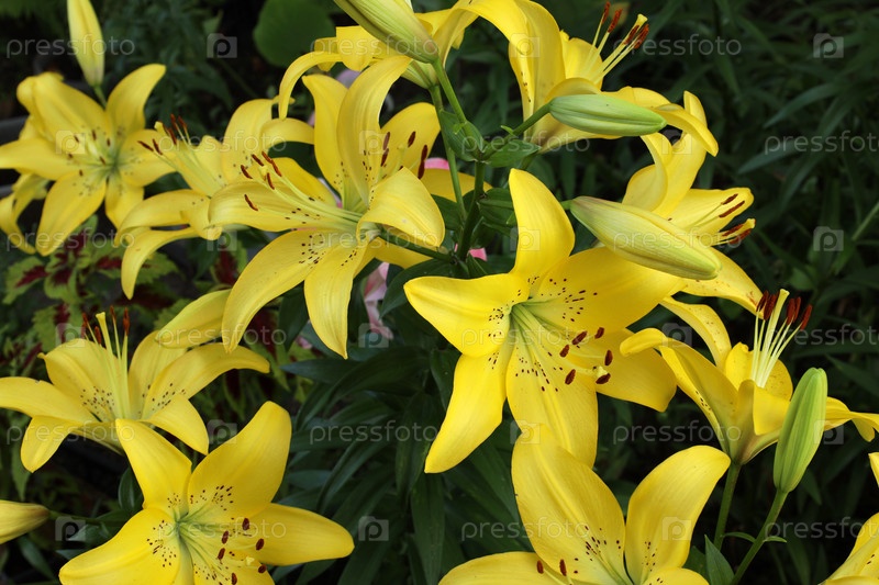 Цветущие желтые лилии с крапинками на лепестках в центре цветка
