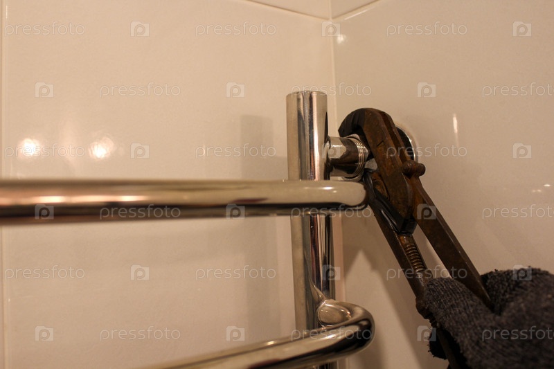 Сантехник откручивает гайку металлического полотенцесушителя гаечным ключом в ванной