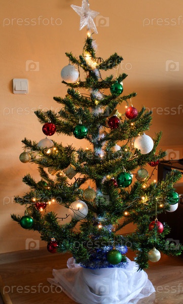 Невысокая елка украшена разноцветными шарами, гирляндами и звездой