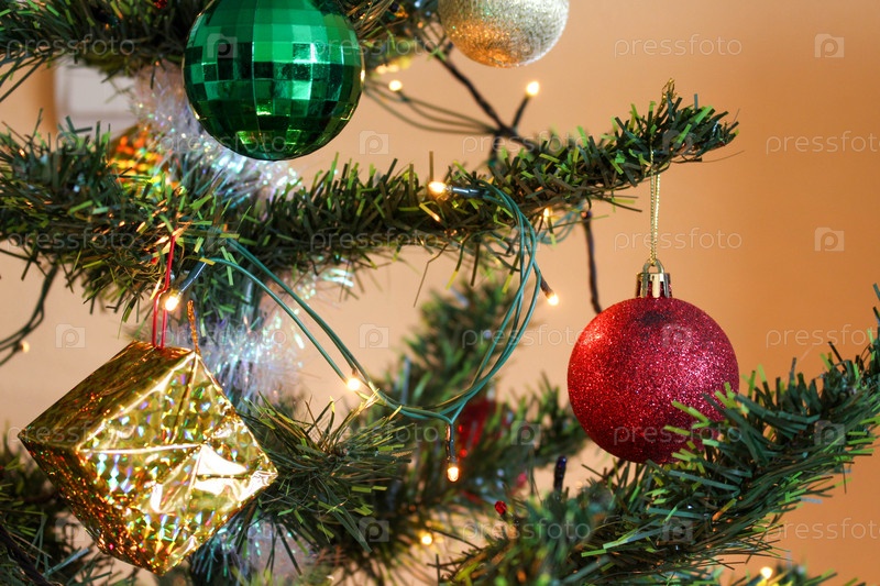 Золотой куб, зеленый, красный шар - новогодние игрушки, праздничное настроение
