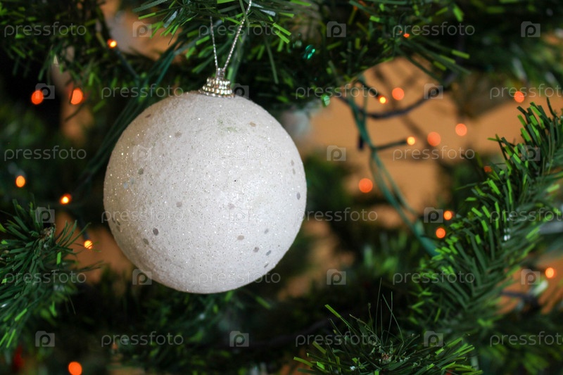 Белый шар на ветке елки крупным планом, гирлянда загорается
