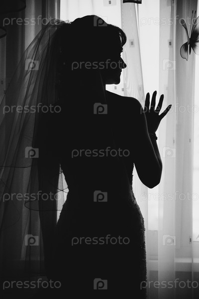 Черный силуэт невесты, стоящей у окна в комнате крупным планом днем
