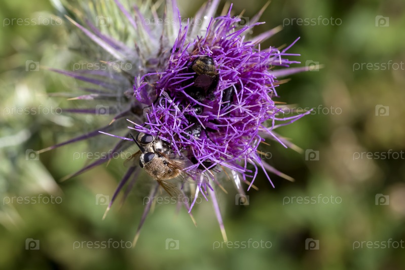 Шмель (Bombus) собирает нектар на цветке в крупном плане