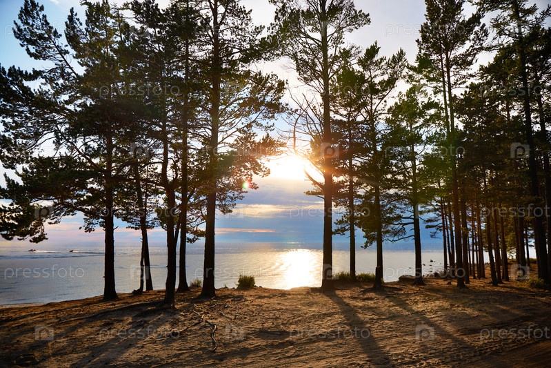 Закат над озером. Лучи солнца пробиваются сквозь крону сосен