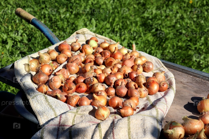 Головки репчатого лука лежат на солнце на садовой тачке в саду