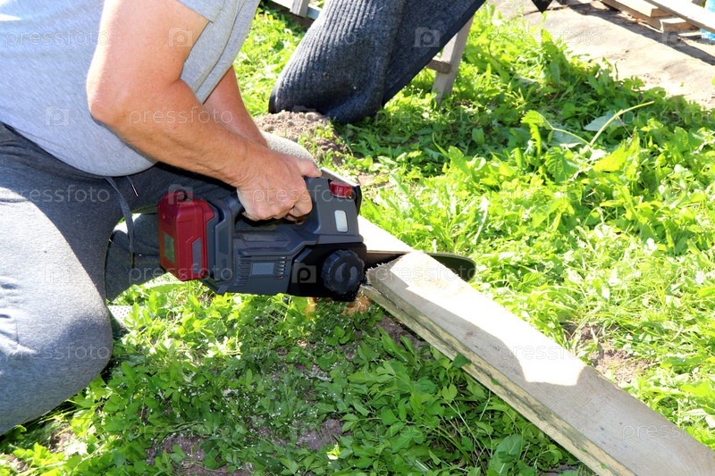 Мужчина распиливает электропилой доску на траве в саду - руки, крупный план