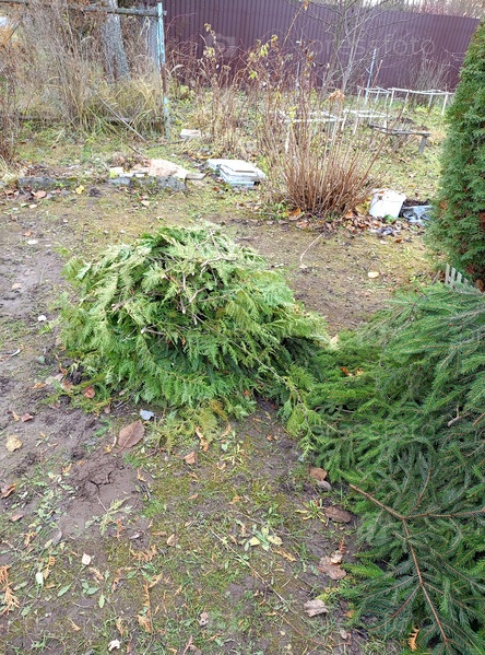 Подготовленные ветки туи и ели для зимнего укрытия растений в саду осенью