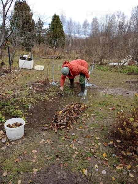 Пенсионер наклонился и убирает опавшие листья в саду осенью