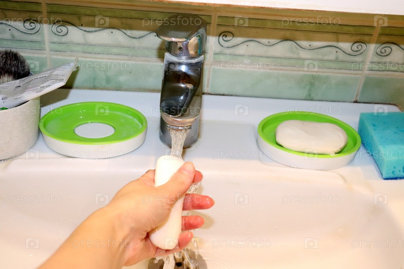Женская рука с мылом под струей воды в ванной квартиры