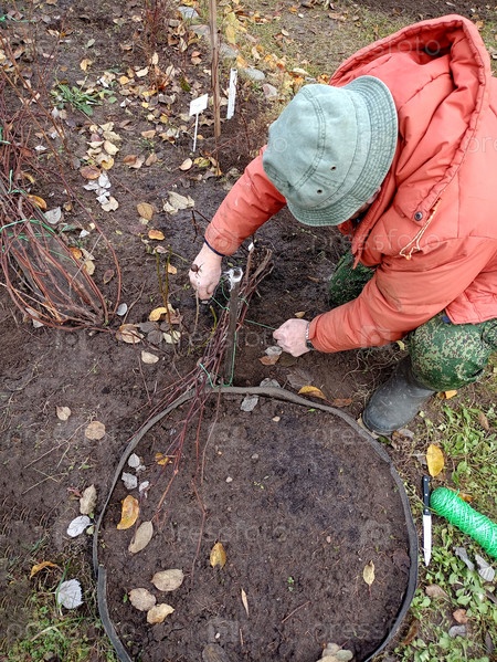 Мужчина перевязывает прижатые к земле виноградные лозы для укрытия перед зимой