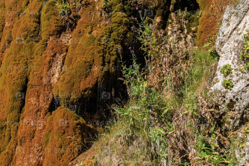 Из выросших мхистых скал течет небольшой водопад Гришкина балка, Карачаево-Черкесская Республика, Россия Небольшой водопад протекает вниз по мокрым камням