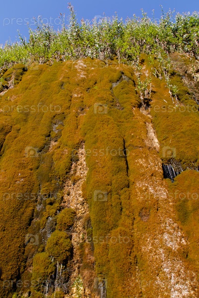 Из выросших мхистых скал течет небольшой водопад Гришкина балка, Карачаево-Черкесская Республика, Россия Небольшой водопад протекает вниз по мокрым камням