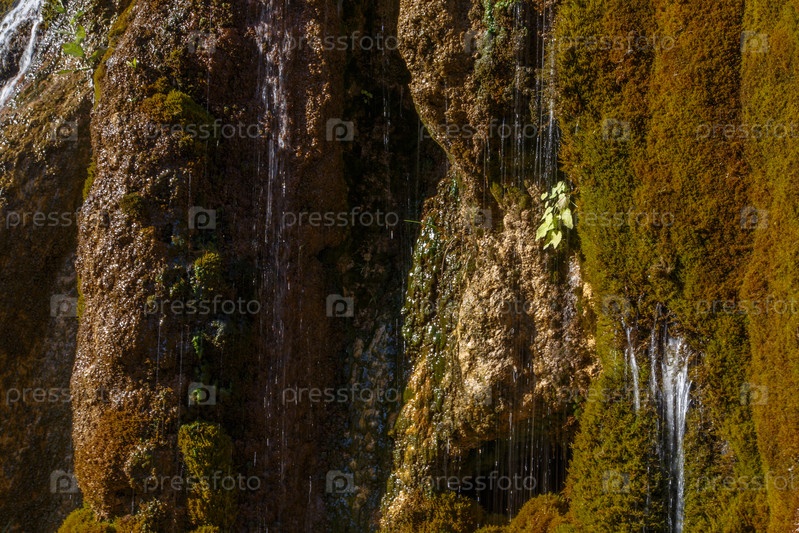 Из выросших мхистых скал течет небольшой водопад Гришкина балка, Карачаево-Черкесская Республика, Россия Небольшой водопад протекает вниз по мокрым камням