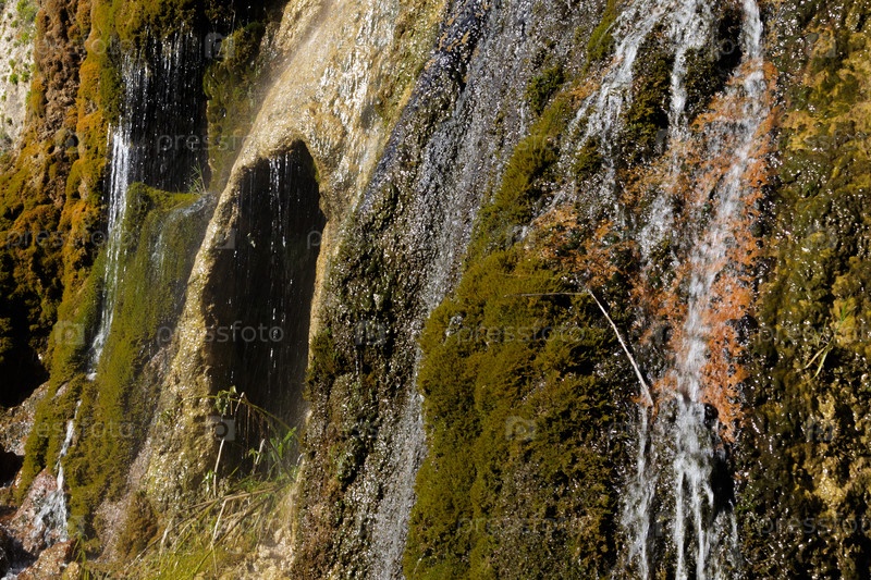 Из выросших мхистых скал течет небольшой водопад Гришкина балка, Карачаево-Черкесская Республика, Россия Небольшой водопад протекает вниз по мокрым камням