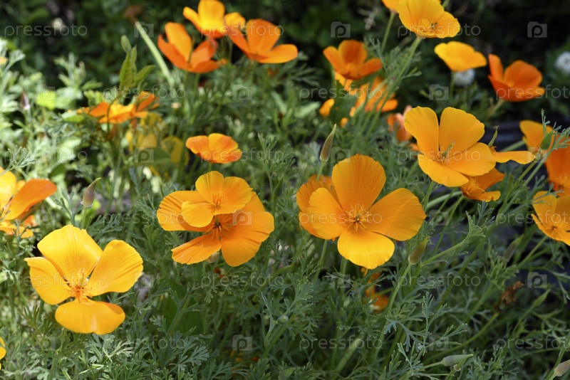 Оранжевые цветы на откосе на зеленом кусте. Цветы эшшольции