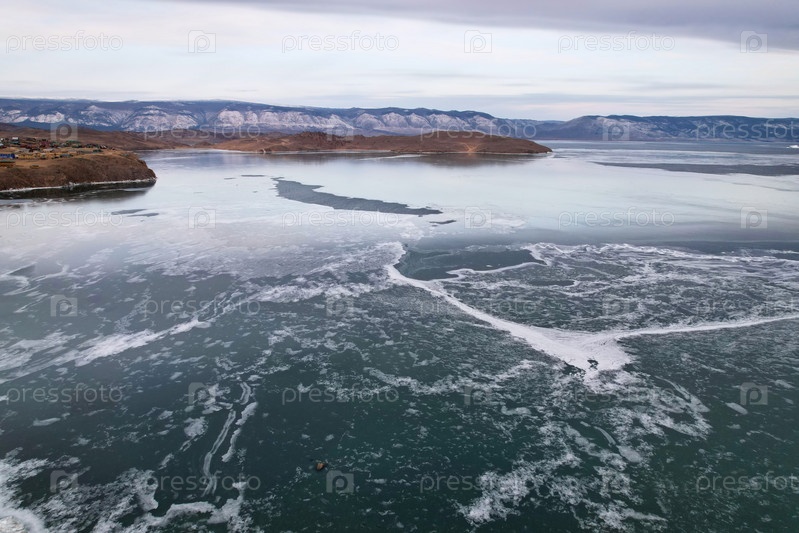 Замерзшее озеро Байкал в декабре с воздуха