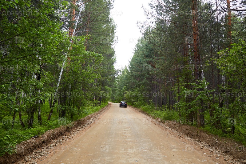 Летом машина едет по гравийной дороге через лес