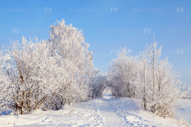 Красивый зимний пейзаж. Заснеженные деревья и кусты, тропинка