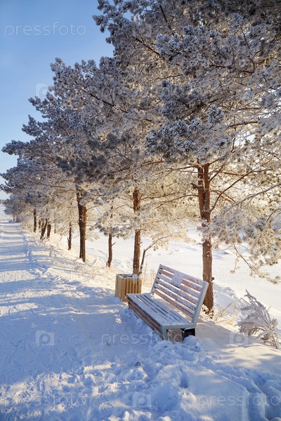 Городской парк в солнечный морозный день. Снег на соснах, деревянная скамейка