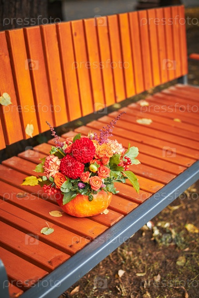 Красивый букет осенних цветов в тыкве на скамейке на улице. Красивый цветочный декор для Дня благодарения и Хэллоуина. Осенний декор