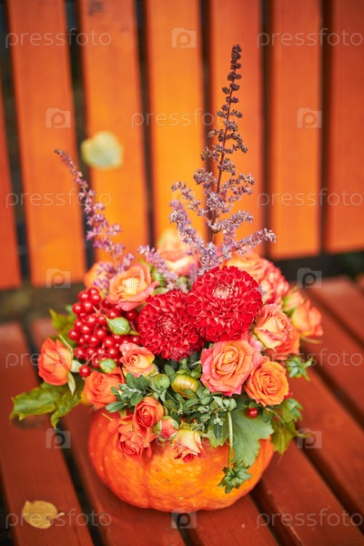 Красивый букет осенних цветов в тыкве на скамейке на улице. Красивый цветочный декор для Дня благодарения и Хэллоуина. Осенний декор