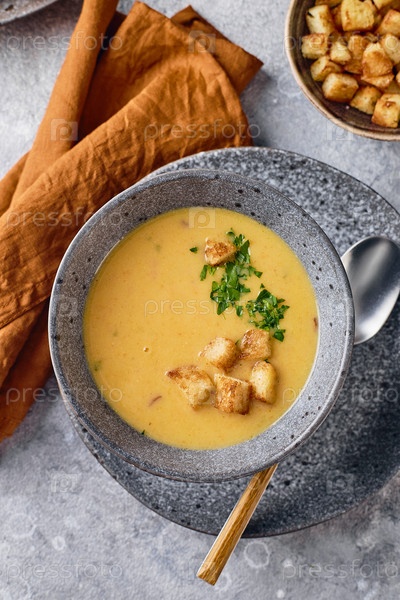 Миска картофельного супа-пюре с ложкой на тарелке. Миска наполнена желтым супом-пюре и украшена гренками, петрушкой и молотым красным перцем