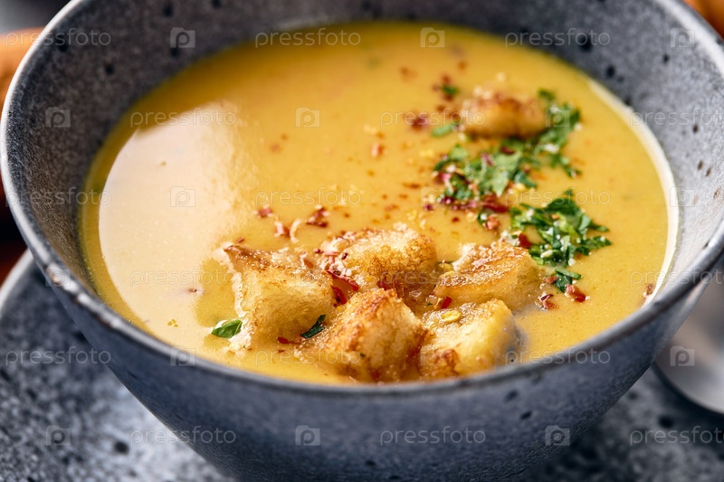 Миска картофельного супа-пюре с ложкой на тарелке. Миска наполнена желтым супом-пюре и украшена гренками, петрушкой и молотым красным перцем