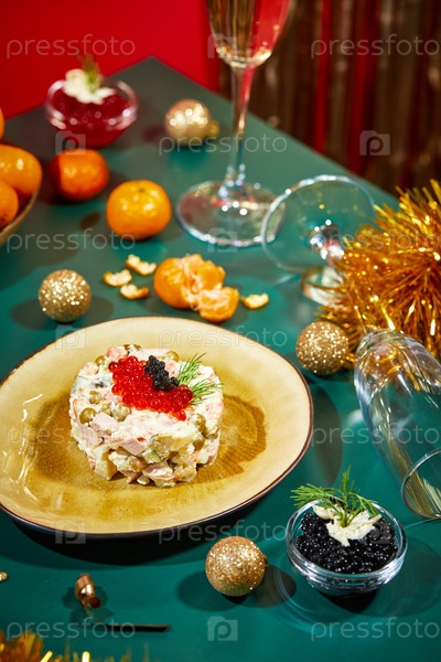 Сервировка стола на Новый год или Рождество в русском стиле с шампанским в бокале, мандаринами и порционным салатом Оливье на тарелке, украшенной красной и черной икрой