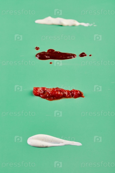 Набор различных соусов - сальса, кетчуп, табаско, ранч и сметана на зеленом фоне. Набор текстур размазанных соусов