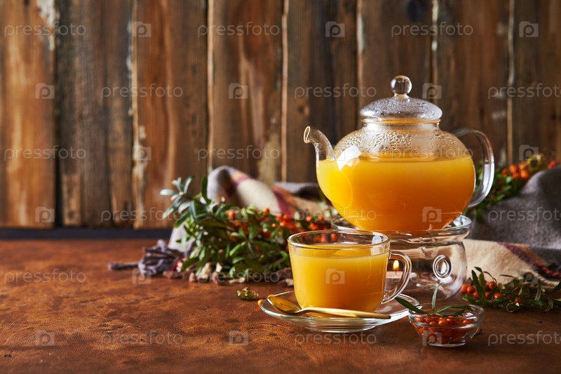Стеклянный чайник и чашка облепихового чая на деревянном фоне. Уютная осенняя композиция