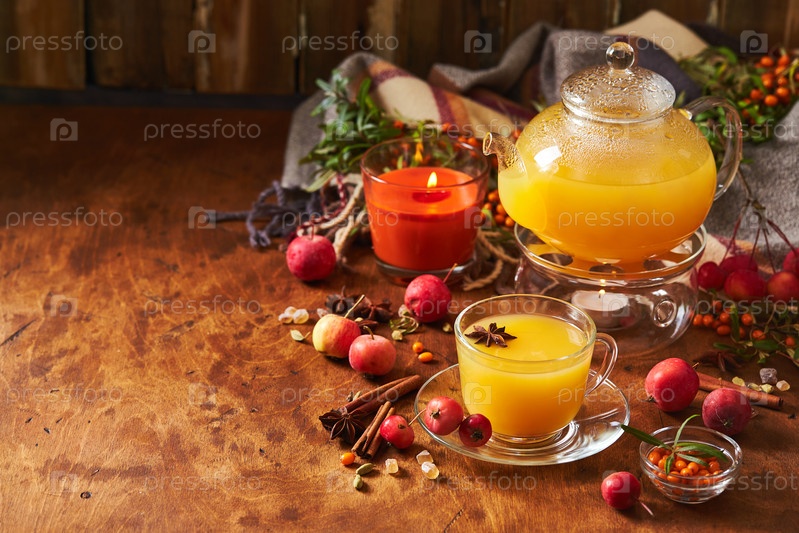 Стеклянный чайник и чашка с облепиховым чаем со специями и осенними маленькими яблонями на деревянном фоне. Уютная осенняя композиция